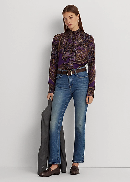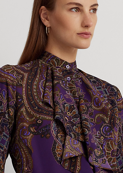 Un volant en cascade volumineux sur la patte confère une touche de fantaisie à cette chemise confectionnée en georgette pour un toucher aérien et un drapé fluide. Elle est rehaussée du motif cachemire d’inspiration bohème de la saison.