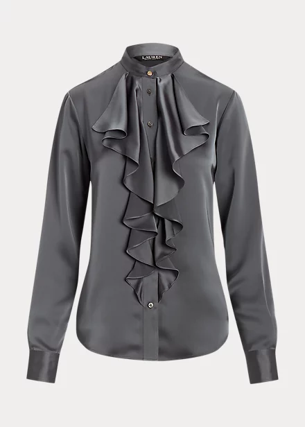 Un volant volumineux en cascade sur la patte confère une touche fantaisie à cette chemise, confectionnée en charmeuse de satin douce pour un éclat brillant et un drapé fluide. Nos boutons distinctifs gravés complètent le look.