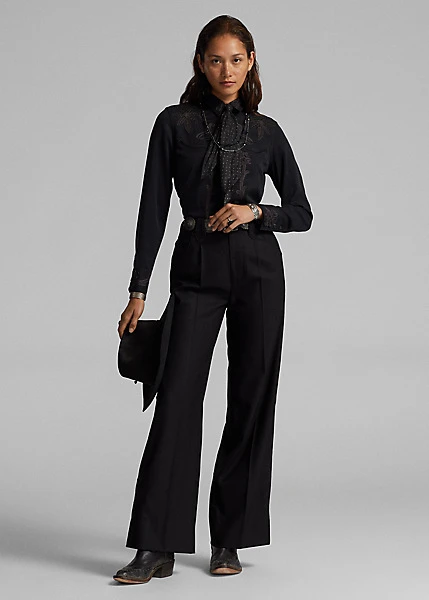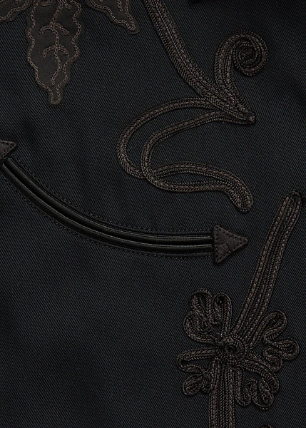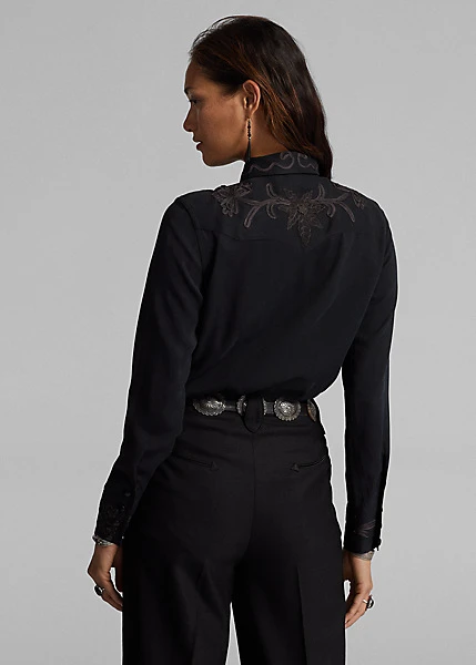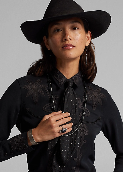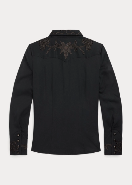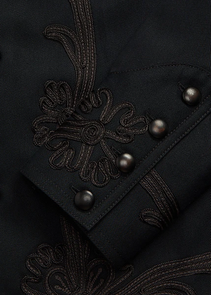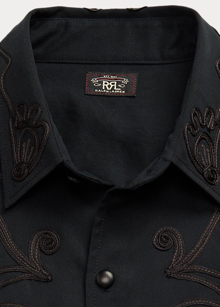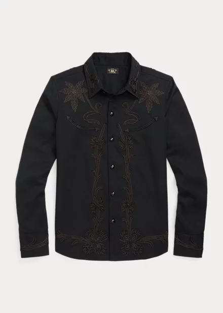 Chemise en sergé léger. Les soutaches brodées et fleuries sur l’ensemble sont inspirées d’une cape des années 1890. Col, empiècement dos, poignets et poches de style western. Boutons Corozo.