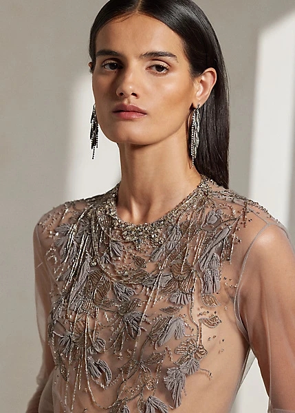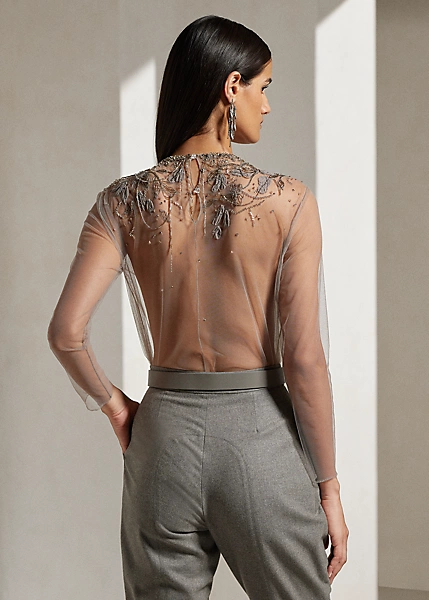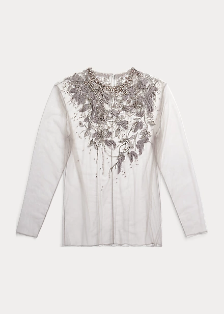 Dans la lignée du charme romantique de la saison, le chemisier Fiorenzo est un concentré de savoir-faire artisanal. Grâce au travail dévoué de quatre experts brodeurs, la silhouette cintrée légèrement décontractée du modèle Fiorenzo est perlée à la main d’un motif inspiré de la nature, composé de fleurs et de feuilles confectionnées dans un mélange de matières, dont des perles en verre, des cristaux, de la georgette de soie et une frange, pour créer un effet dégradé. Sa confection en tulle transparent est tissée à partir de fils ultra-fins, tandis que sa doublure caraco en soie naturelle apporte de l’opacité.