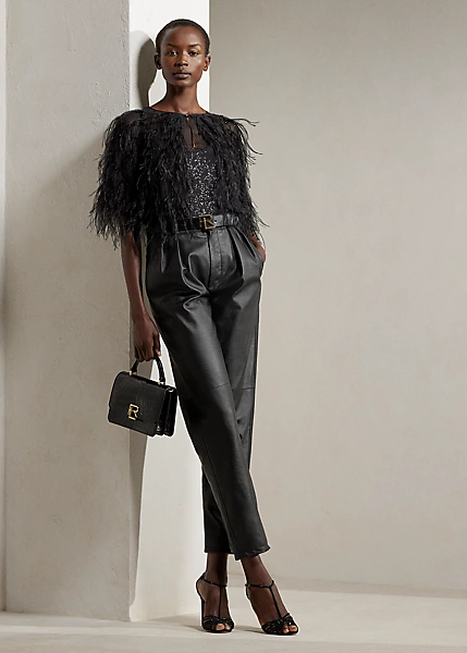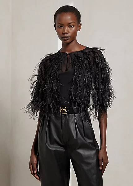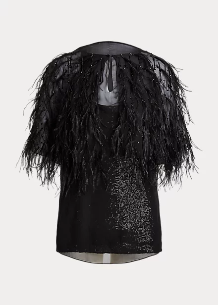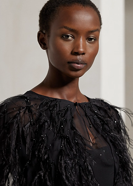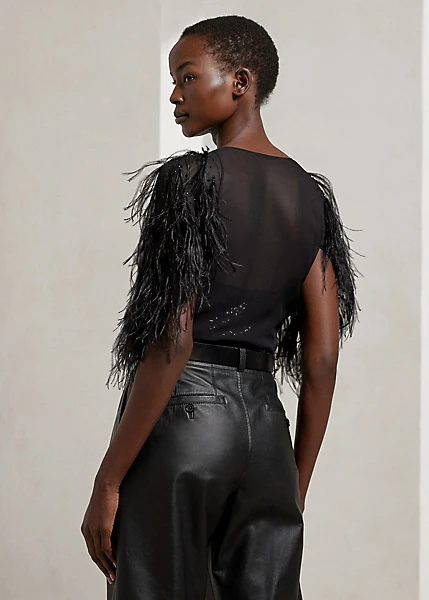 Basique raffiné pour les sorties après le travail, le modèle Kerenza revisite les tenues de soirée. Arborant une coupe décontractée, ce chemisier est rehaussé d’une ouverture goutte d’eau sur l’encolure pour plus d’accessibilité, qui se ferme au moyen d’un bouton en cristal noir ton sur ton. Grâce au savoir-faire artisanal de quatre brodeurs spécialisés, ses manches drapées sont brodées à la main selon une technique ari spéciale pour un dégradé de matières, notamment des perles noires ton sur ton, des plumes d’autruche et des franges. Sa confection en mousseline de soie semi-transparente, choisie pour son drapé élégant et son éclat subtil, est doublée d’un caraco à sequins ton sur ton pour plus d’opacité.
