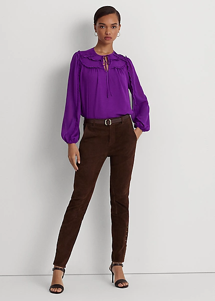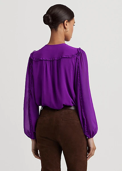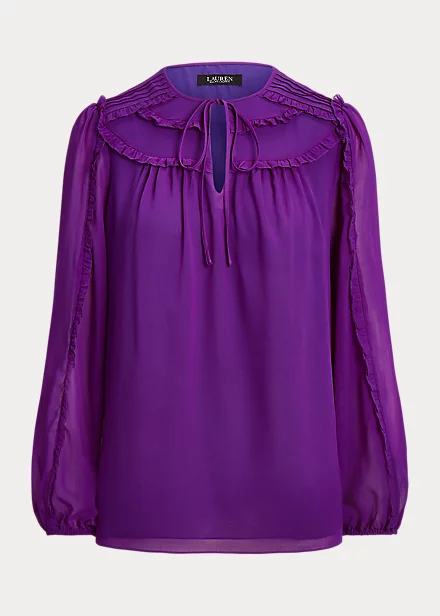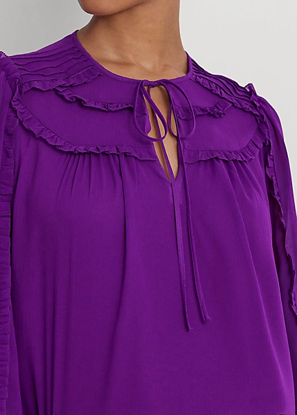 Rehaussé d’une bordure volantée, de manches à effet blousant et de liens à nouer, ce chemisier est empreint d’un romantisme décontracté. Arborant une silhouette décontractée, ce modèle est confectionné en georgette froissée et légère pour un joli drapé.