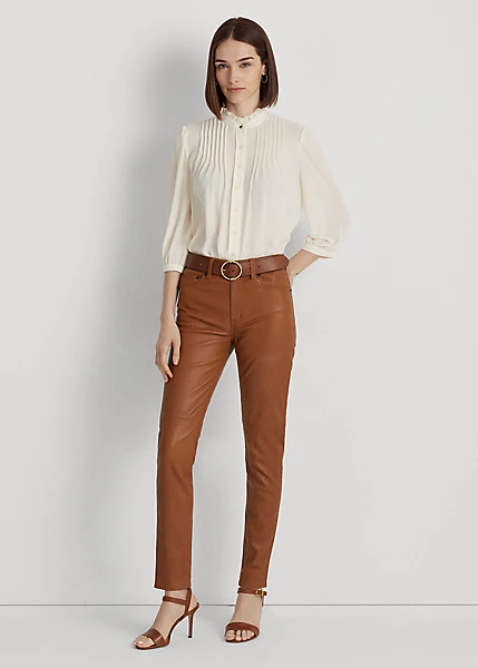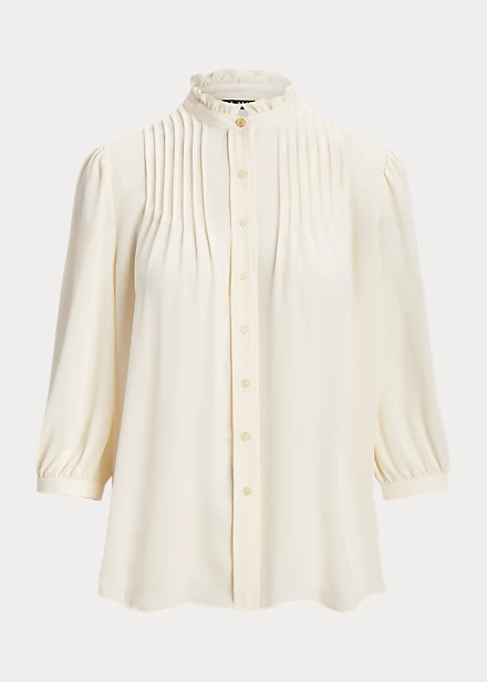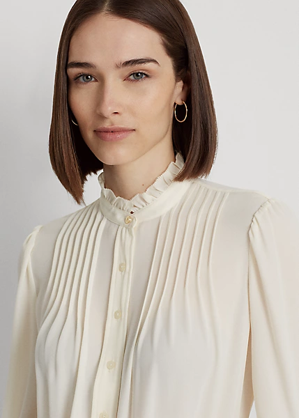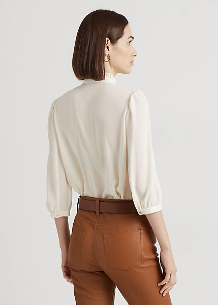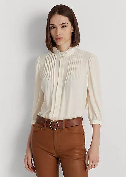 Empreint de romantisme, ce chemisier en georgette aérienne est doté de manches à effet blousant, d’une bordure volantée et de plis sur le haut. Des boutons gravés de l’inscription « Lauren Ralph Lauren » lui confèrent une touche finale distinctive.