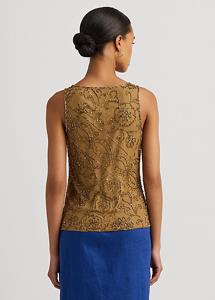 La silhouette décontractée de ce chemisier sans manches est confectionnée en piqué aérien orné de perles élaborées très glamour.