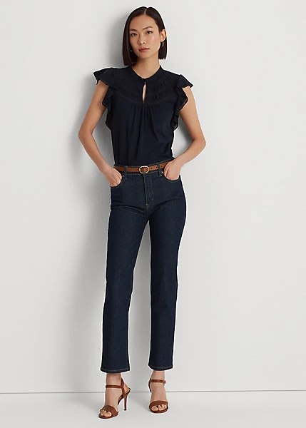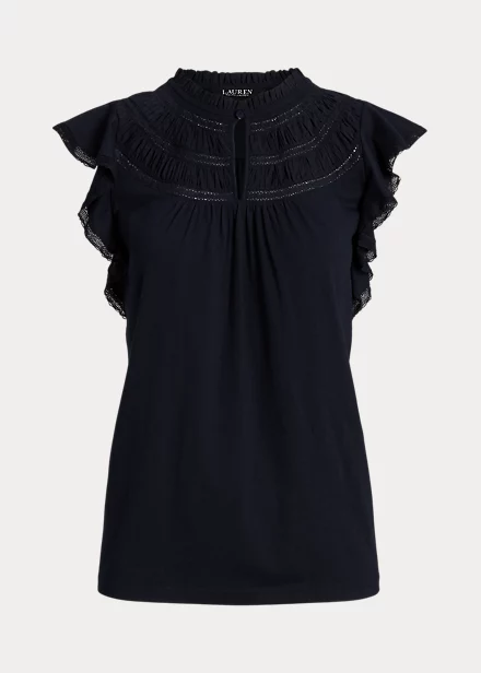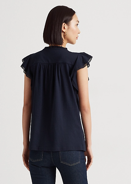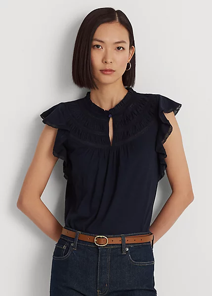 Les mancherons volantés originaux, la bordure de volants et les inserts de dentelle rehaussent l’allure féminine de ce haut aérien, confectionné en jersey de coton mélangé léger. Ralph Lauren s’associe à Better Cotton™ pour améliorer la culture du coton dans le monde.
