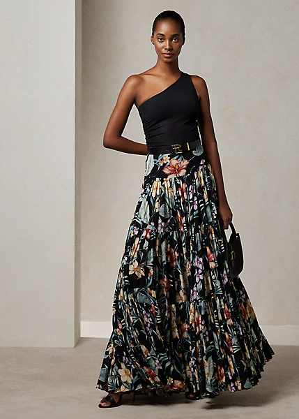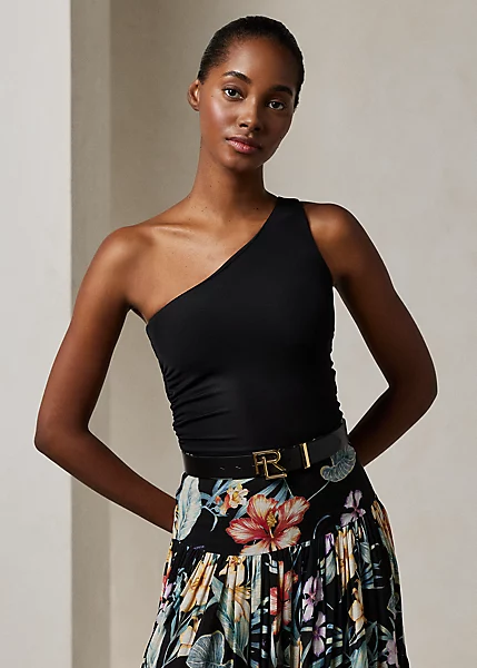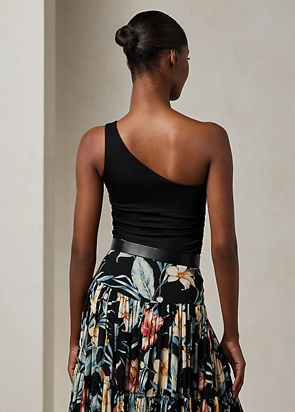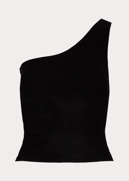 Ce débardeur asymétrique arborant des ruches sur la couture latérale droite est tricoté en interlock stretch italien, un tissu mat fluide réputé pour sa coupe flatteuse et son confort.