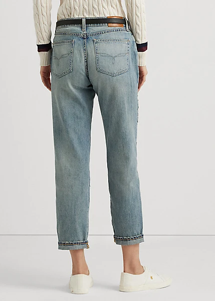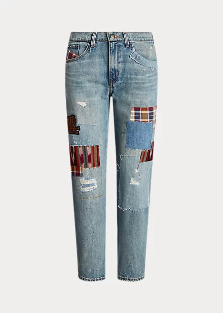 Confectionné en confortable sergé tissé de droite à gauche, cet élégant jean se caractérise par une silhouette fuselée facile à porter, une taille mi-haute et un patchwork artistique sur l’ensemble pour un look d’inspiration bohème.