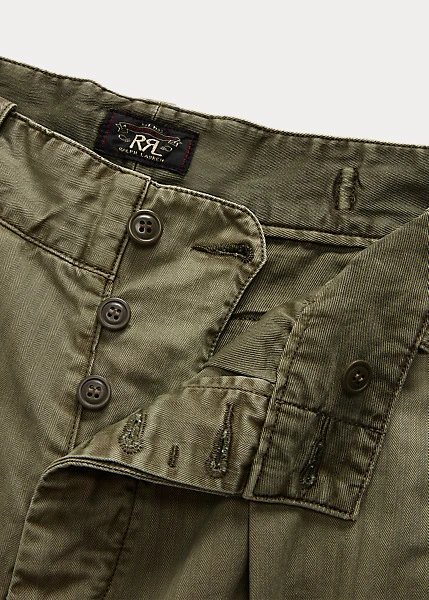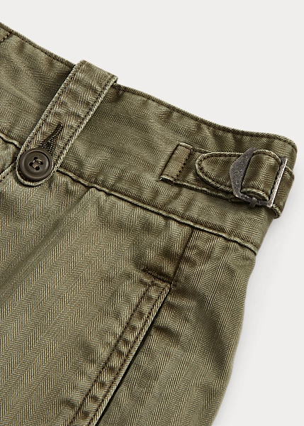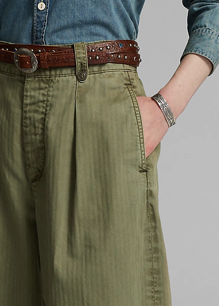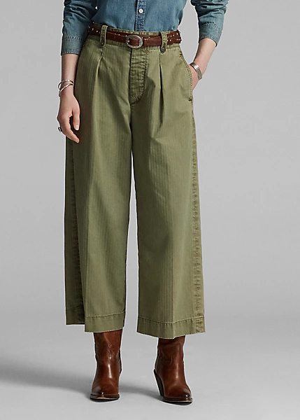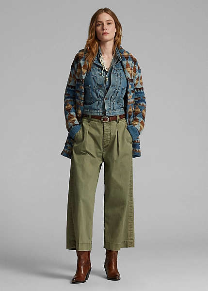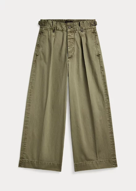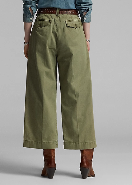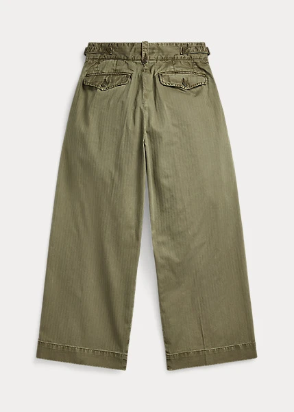 Pantalon 7/8 à jambe large inspiré des pantalons des années 40. Confectionné en sergé de coton japonais teint en pièce. Poches à rabat cousues à la main derrière et pinces cousues devant. Passants de ceinture boutonnés et pattes réglables sur les côtés. Stonewashed.