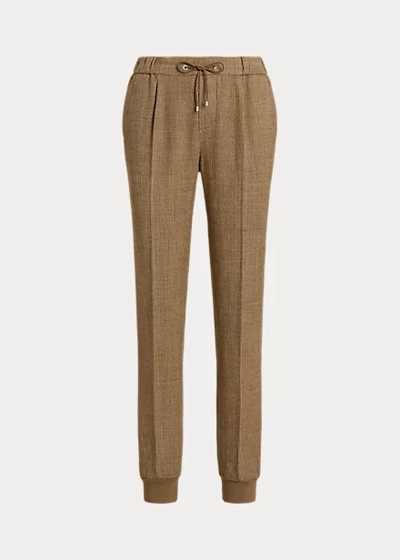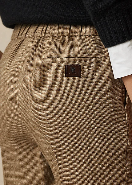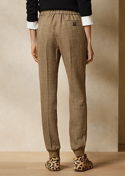 Version luxueuse du pantalon de jogging décontracté, le modèle slim Arsenia est confectionné dans un tweed de soie mélangée italienne à motif pied-de-poule, ce qui lui confère une texture subtile et une grande légèreté. Son motif miniature — réalisé dans deux couleurs contrastées — apporte une touche élégante tandis que les ornements et le patch en agneau orné du monogramme « RL » superposé offrent une finition distinctive.