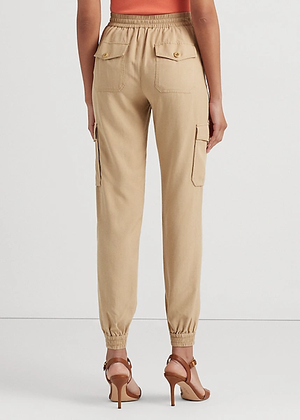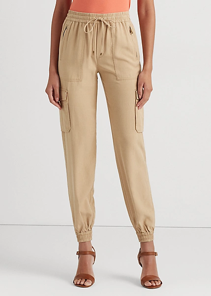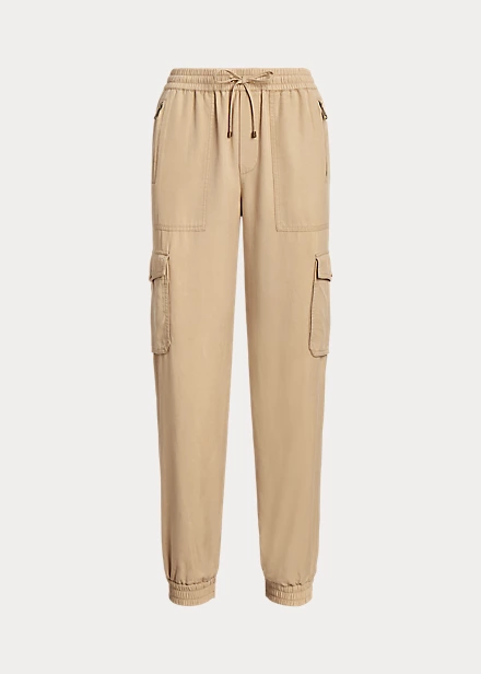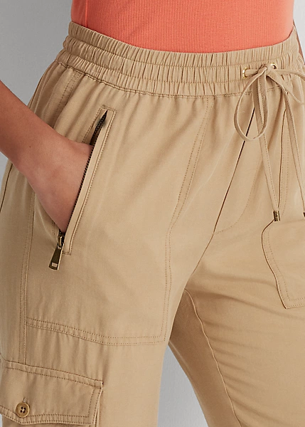 Ce pantalon cargo en sergé léger reste fidèle au style traditionnel avec ses poches d’inspiration utilitaire et ses zips apparents. Une taille haute lui confère une coupe flatteuse, tandis qu’une taille élastique à cordon de serrage sublime son allure décontractée.