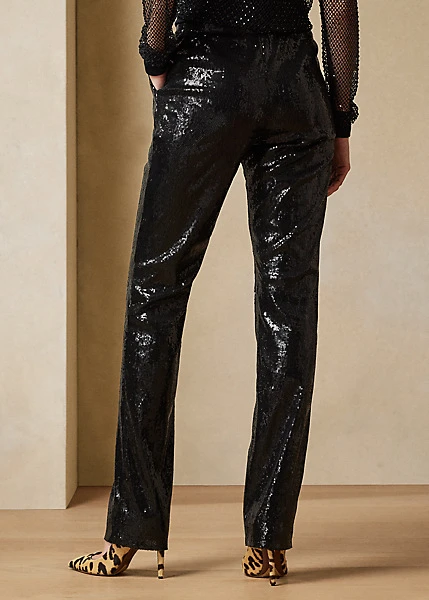 Arborant une taille mi-haute et une silhouette slim, le pantalon Haldan de fabrication italienne allie des éléments intemporels, notamment une patte allongée sur la taille et des pinces sur l’arrière de la taille, avec une confection à sequins sur l’ensemble pour un look glamour et étincelant.