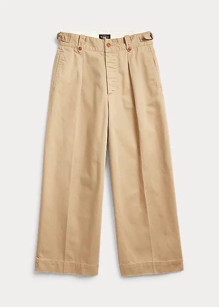 Inspiré des pantalons des années 40. Confectionné en sergé de coton japonais teint en pièce. Poches arrière à rabat. Plis cousus sur le devant. Passants à bouton et pattes réglables sur les côtés. Stonewashed.
