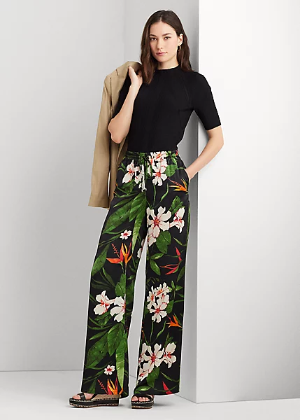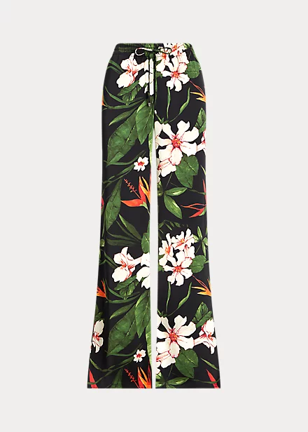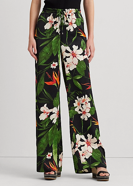 Le toucher doux de la charmeuse de satin confère un éclat brillant à ce pantalon décontracté à cordon de serrage arborant une silhouette à jambe large pour un superbe mouvement. Il est revisité pour la saison avec un motif fleuri tropical.