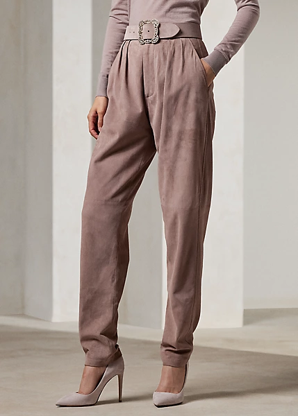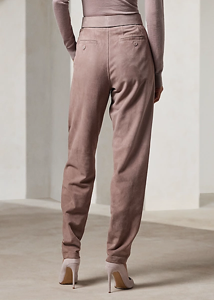 DotĂ© d’une taille haute et d’une silhouette slim, le pantalon Rogers arbore de nombreux Ă©lĂ©ments très soignĂ©s, tels que des pinces doubles sur la taille devant, des pinces Ă l’arrière de la taille, des surpiqĂ»res au niveau des coutures et des boutons en nacre vĂ©ritable. Cette pièce est confectionnĂ©e en Italie en agneau velours souple spĂ©cialement teint pour obtenir son ton mauve unique.