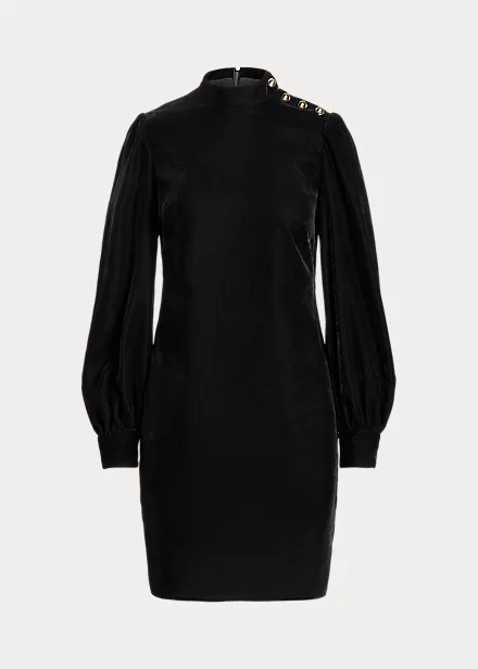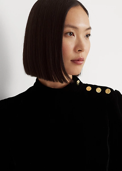 La silhouette droite de cette robe à col cheminée est confectionnée dans un somptueux velours pour un look à l’élégance moderne. Des manches à effet blousant lui confèrent un romantisme subtil, tandis que des boutons gravés du monogramme « LRL » sur l’épaule gauche apportent une touche finale distinctive.