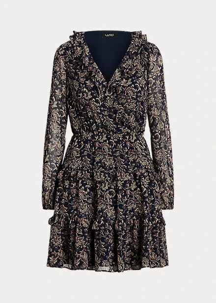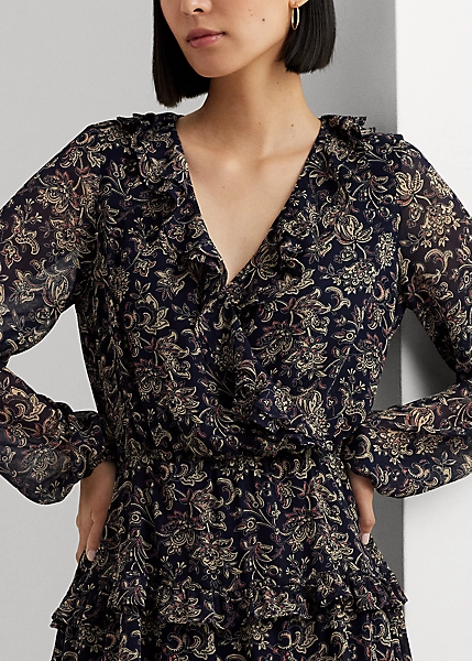 Avec sa bordure volantée, ses manches à effet blousant et le motif fleuri de la saison, cette robe à col en V croisé affiche une élégance décontractée. Dotée d’un haut resserré et d’une jupe gitane évasée, cette pièce est confectionnée en georgette froissée légère, ce qui crée un mouvement gracieux à chaque pas.