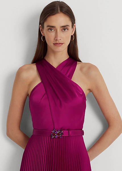 La ceinture ornée de strass rehausse la taille de cette robe de cocktail glamour, qui se caractérise par un décolleté dos nu croisé. Confectionnée en charmeuse de satin brillante, elle arbore une jupe à plis soleil pour créer un mouvement ample.