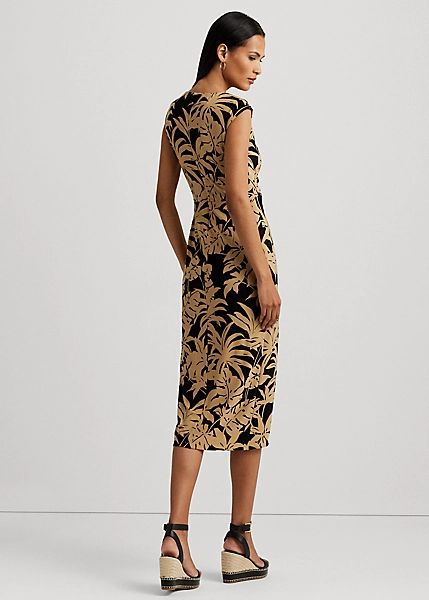 Une jupe effet portefeuille nouée devant et une ouverture goutte d’eau sur l’encolure confèrent un charme naturel à cette robe à mancherons. Rehaussé d’élégants plis et du motif palmes bicolore de la saison, ce modèle est confectionné en jersey stretch doux pour une grande liberté de mouvement.