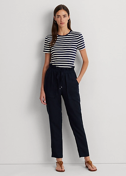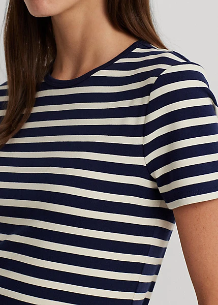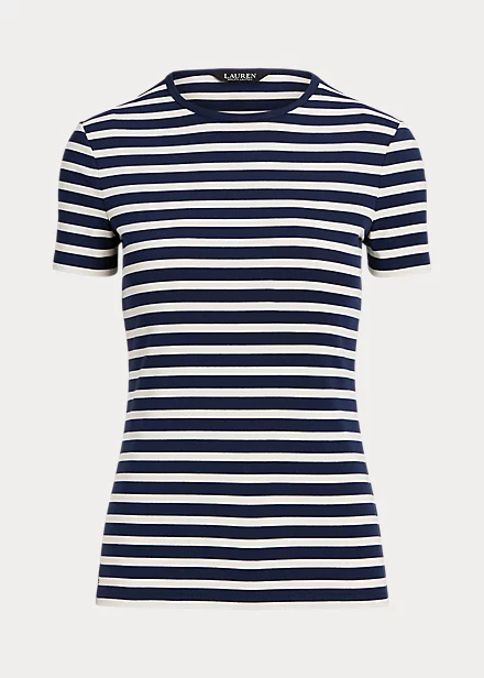 Teint en fil avec des rayures horizontales intemporelles, ce t-shirt à col rond indispensable est confectionné en coton stretch léger pour un toucher doux. Le logo « LRL » brodé sur l’ourlet droit apporte une finition distinctive.