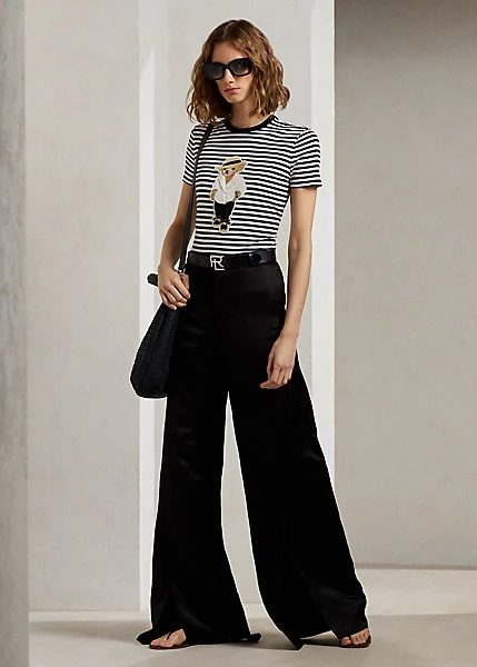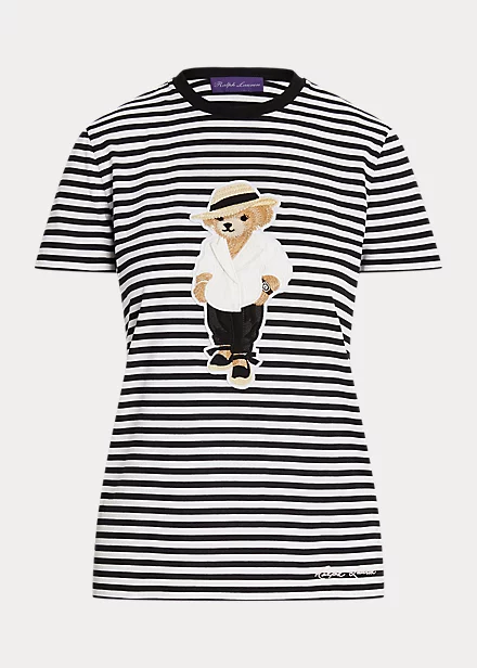 Notre mascotte adorĂ©e est appliquĂ©e sur ce t-shirt rayĂ©, vĂŞtue d’une tenue inspirĂ©e de l’esthĂ©tique luxueuse et dĂ©contractĂ©e de la collection Resort 2024. Un maĂ®tre brodeur a créé le patch Polo Bear avec diffĂ©rentes matières soigneusement choisies, notamment un lin mĂ©langĂ© pour la veste, le pantalon et les espadrilles. Des dĂ©tails supplĂ©mentaires comprennent des revers en trois dimensions, des points brodĂ©s sur le chapeau de paille, des teintes distinctes sur la fourrure de l’ourson et du fil mĂ©tallisĂ© ayant permis de crĂ©er les boucles d’oreilles, le bracelet et la montre Ă Ă©trier. Ce t-shirt est rĂ©alisĂ© en jersey de coton et brodĂ© de notre inscription « Ralph Lauren ».