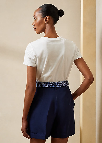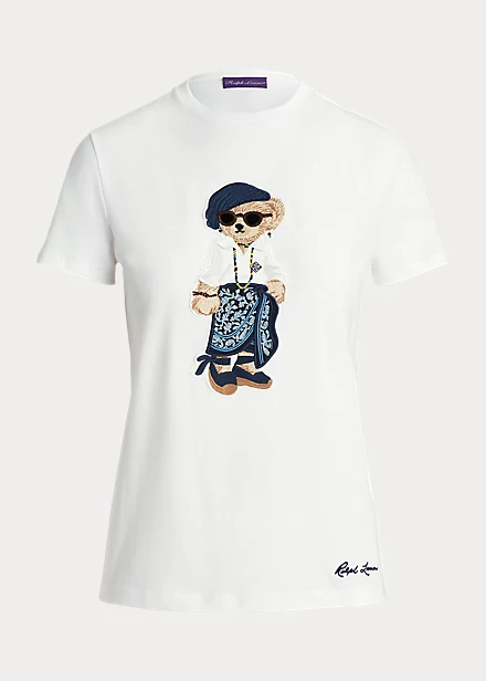 Créée en 1991, notre mascotte adorée est appliquée sur ce t-shirt, vêtue d’une tenue évoquant l’esthétique de la collection Resort 2023. Un spécialiste de la broderie a travaillé sur ce patch en utilisant différentes techniques pour créer le Sarong Polo Bear, confectionné dans des matières soigneusement choisies, notamment du voile de lin pour la chemise et du coton pour le béret et le sarong. Ce t-shirt est réalisé en jersey de coton et brodé de notre inscription « Ralph Lauren ».
